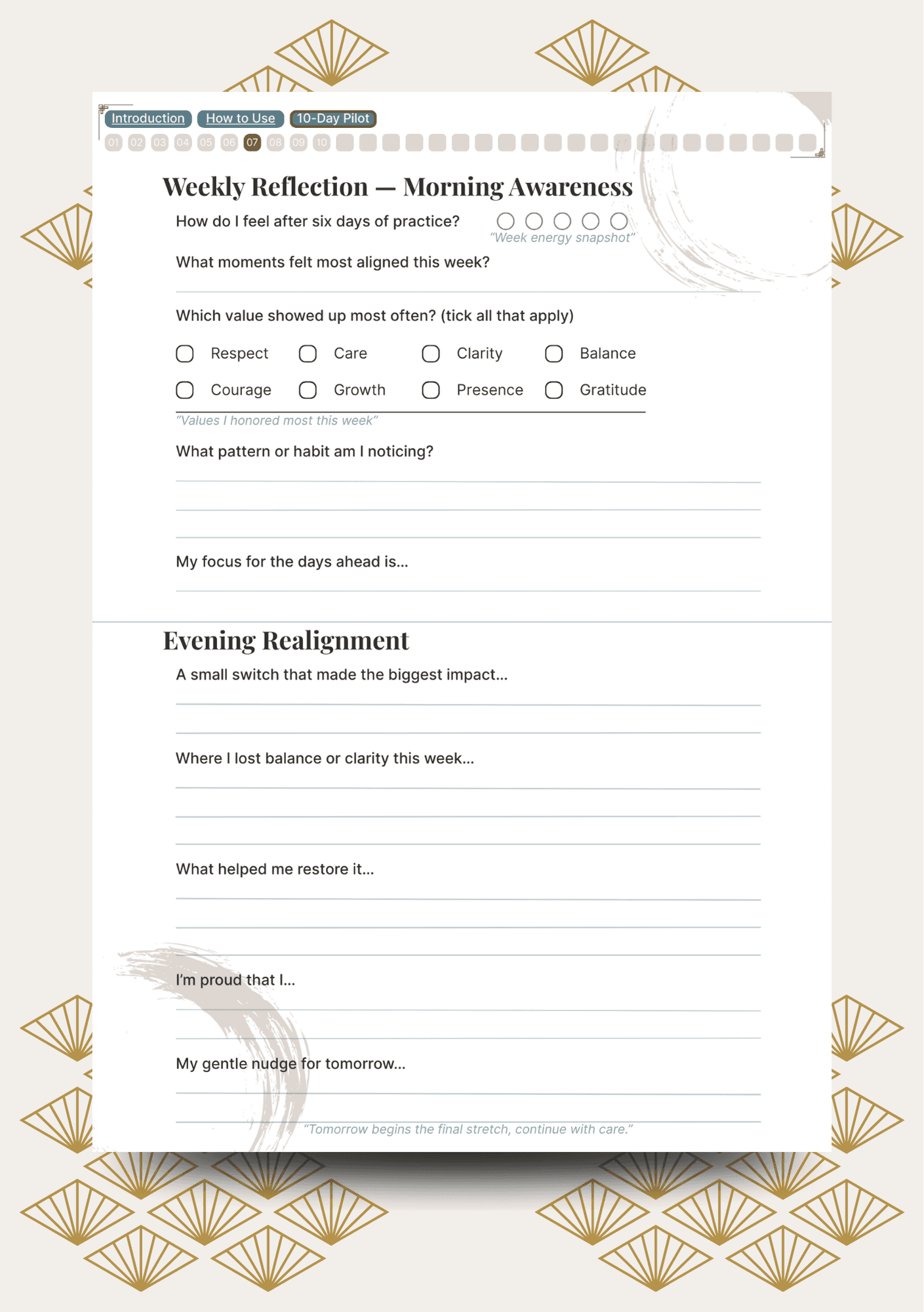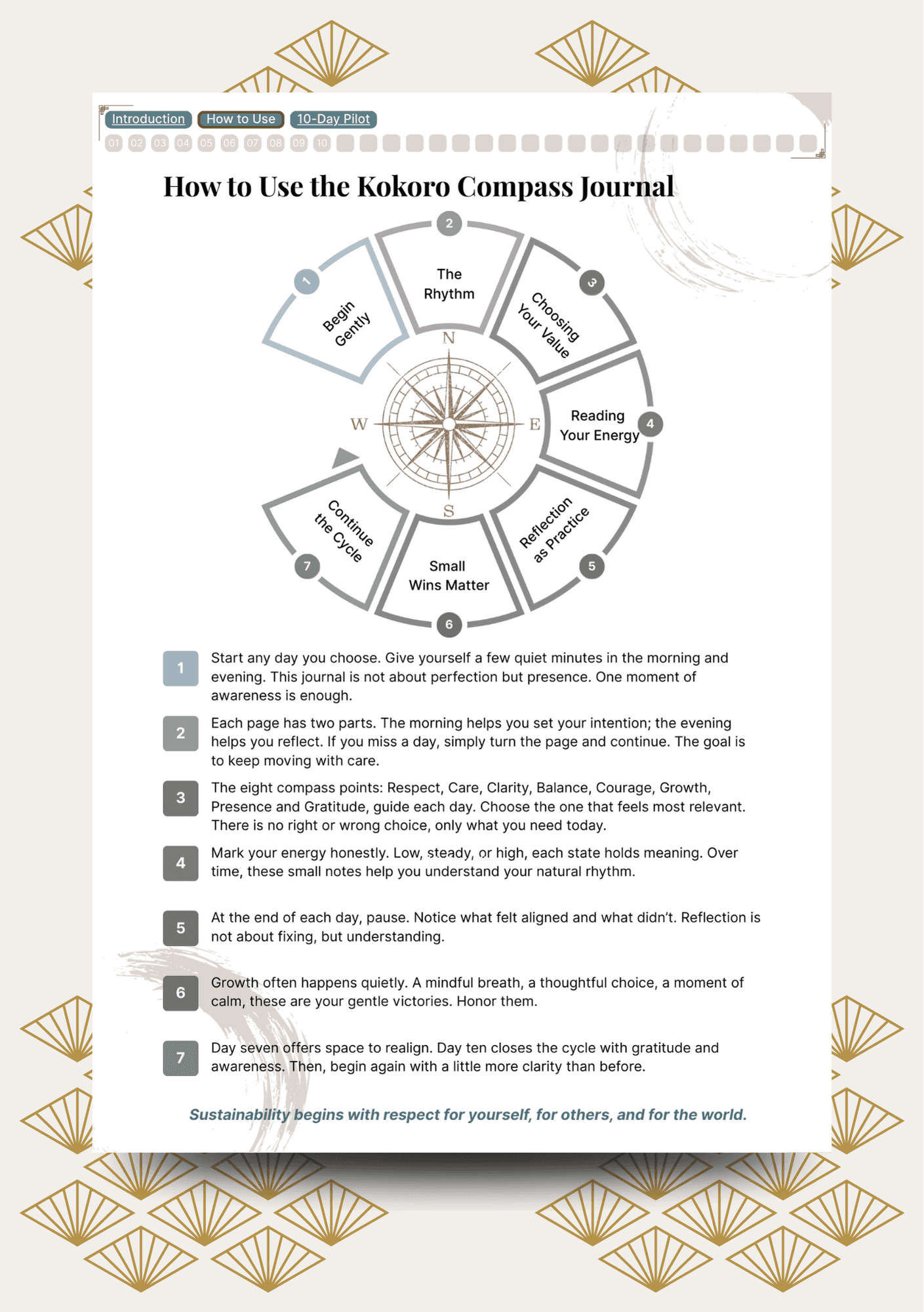 No. You guide the pace. You can move through the days consecutively or spread them out in a way that feels natural. The Kokoro Compass honours your rhythm, not the other way around. For deeper integration and lasting effect it is recommended not to skip more than two days at a time. Even if life interrupts you can always pause, restart or return when you feel ready.