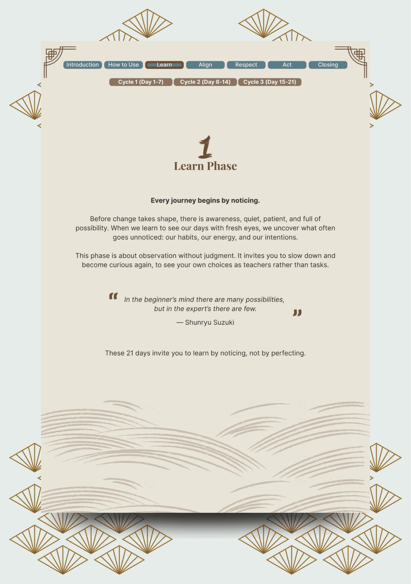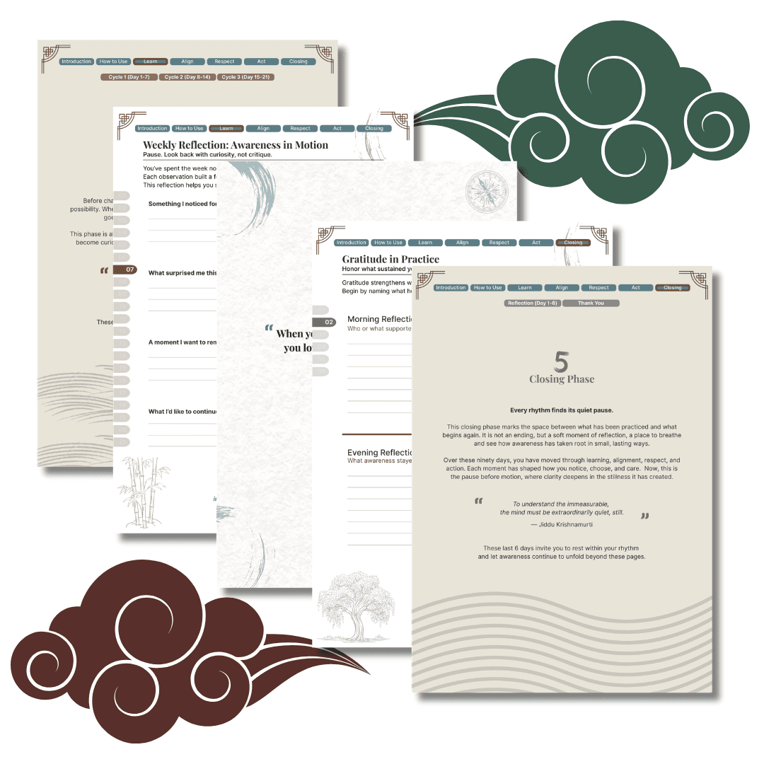 This journal supports presence rather than performance. Through daily reflection and periodic deeper check ins, it invites you to slow down, notice more clearly, reflect with honesty, and act with intention. Inspired by Japanese philosophical principles, it offers a supportive structure that encourages mindful living, emotional balance, and meaningful personal growth over time.