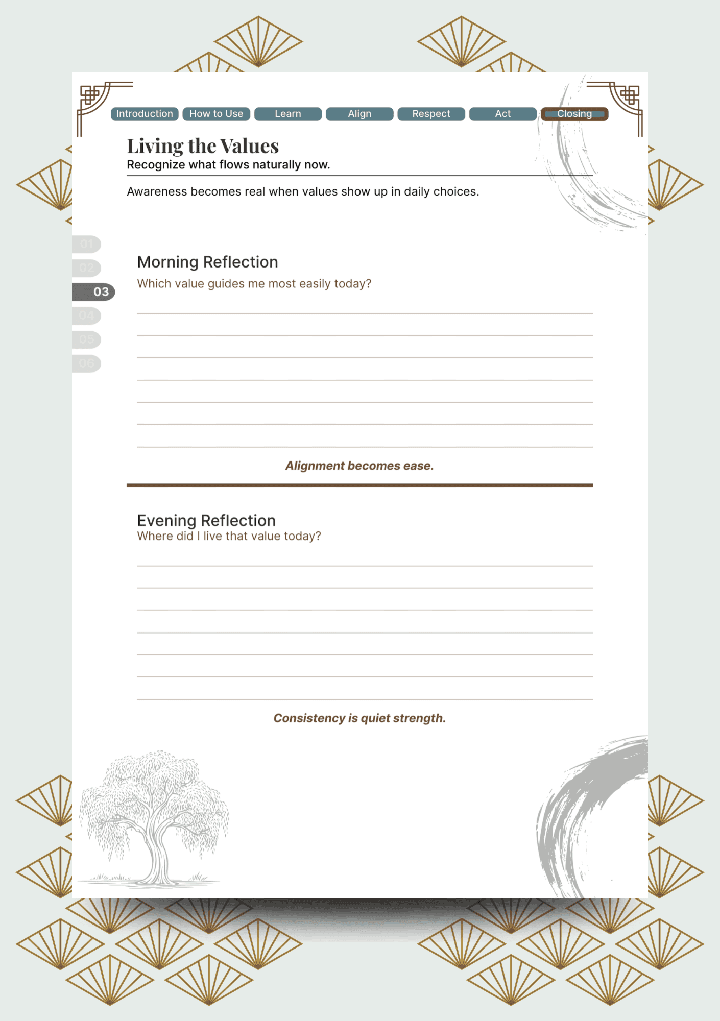 A calm, guided journal designed to help you live with more awareness, intention, and emotional steadiness. It is created for anyone who wants to build mindful habits, reconnect with what truly matters, and integrate personal values into daily life in a gentle and sustainable way, without pressure or perfectionism.