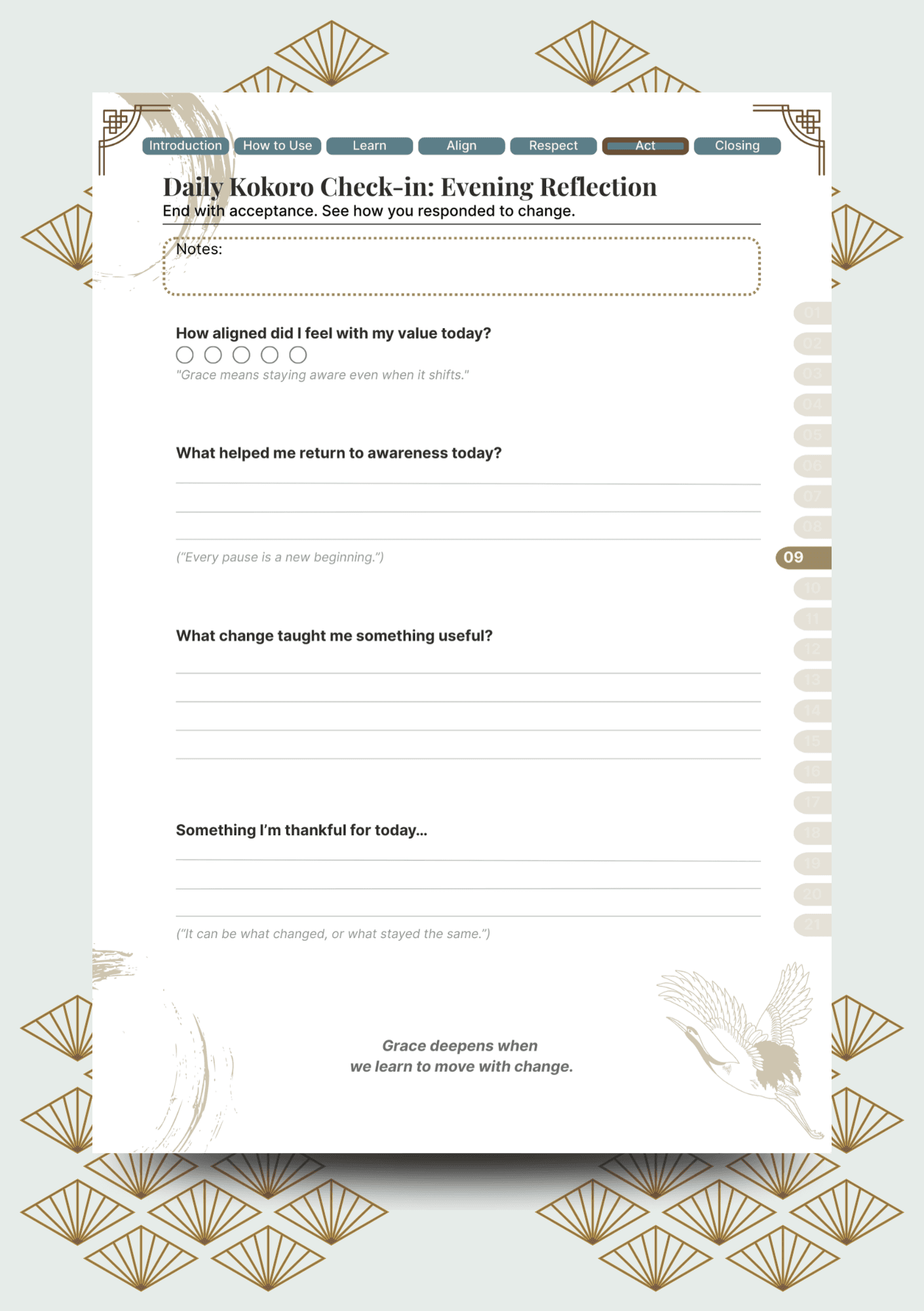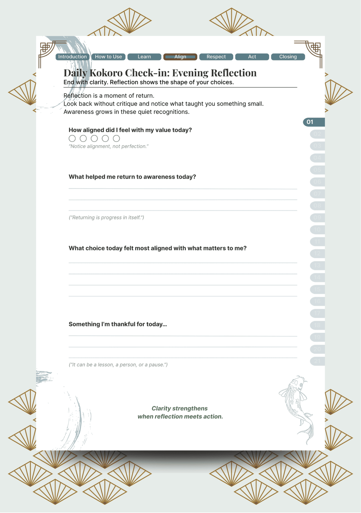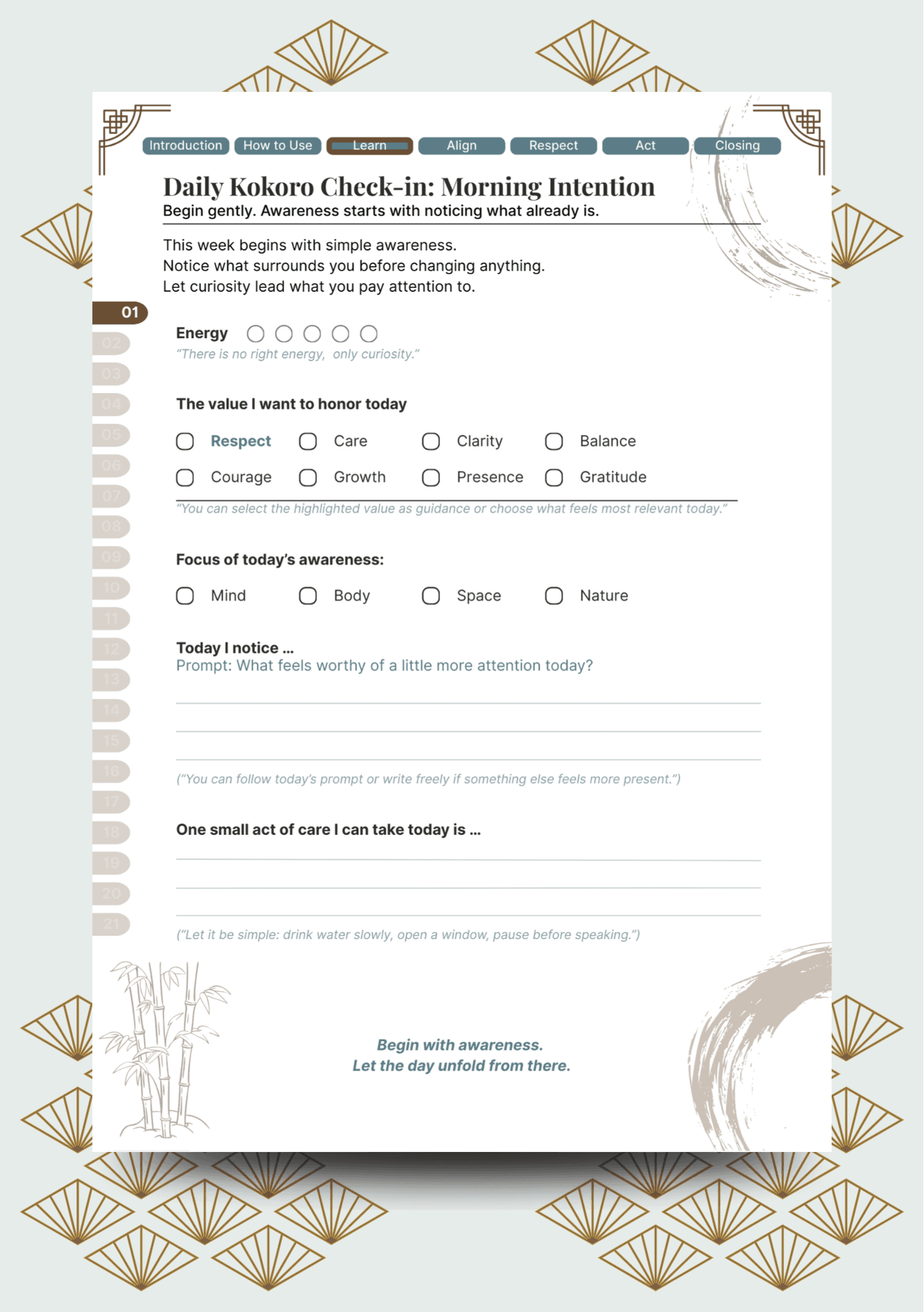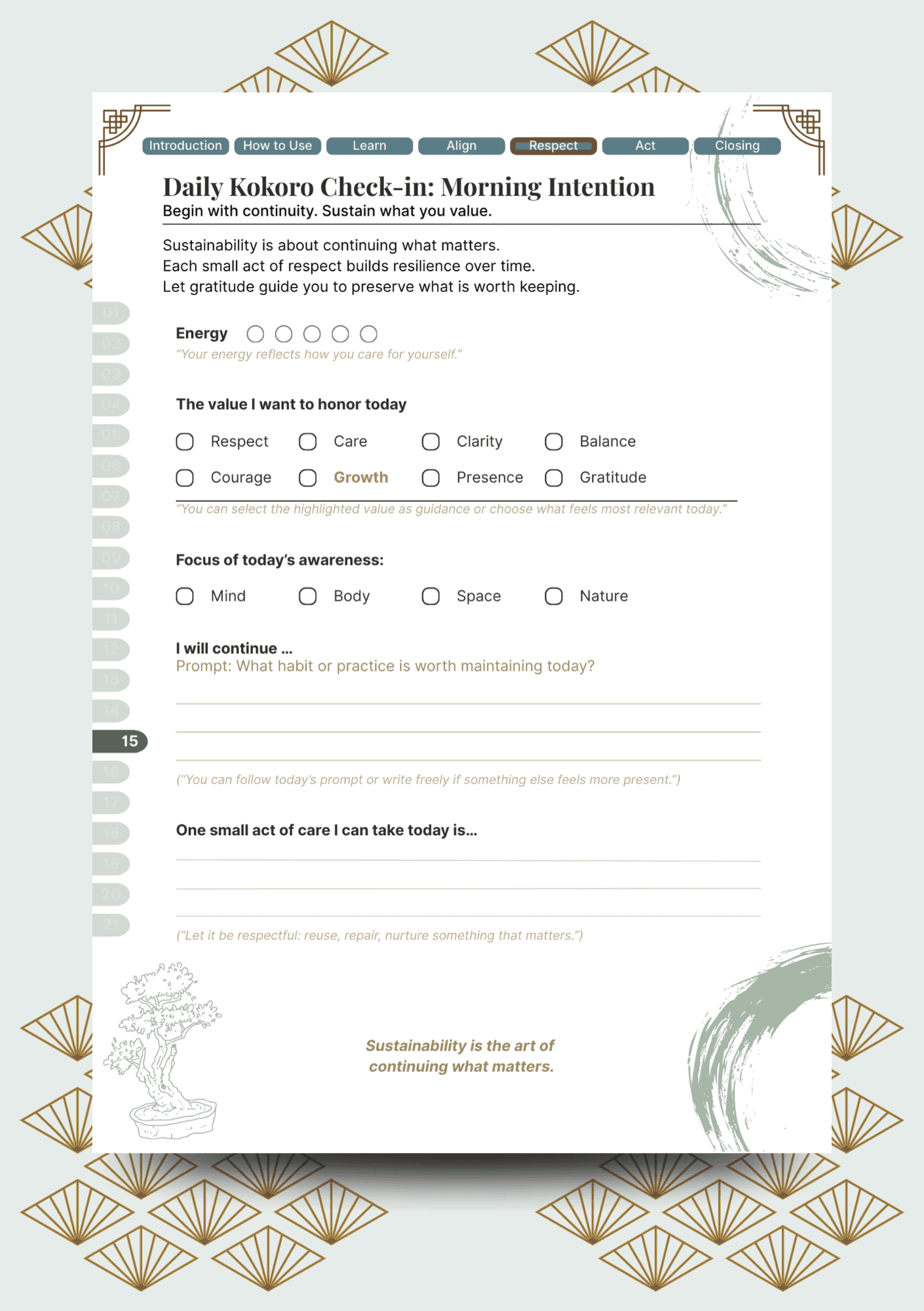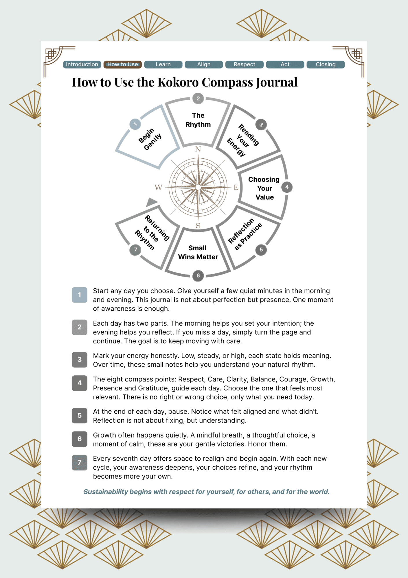 The Kokoro Compass Journal is grounded in the belief that sustainability begins with respect. It focuses on inner alignment, mindful habits, and intentional daily choices, helping sustainability become a lived practice rather than a checklist.